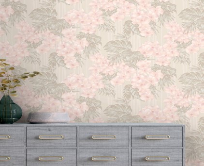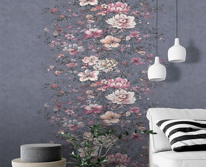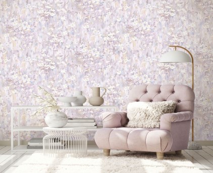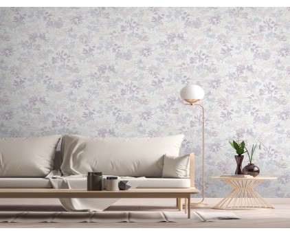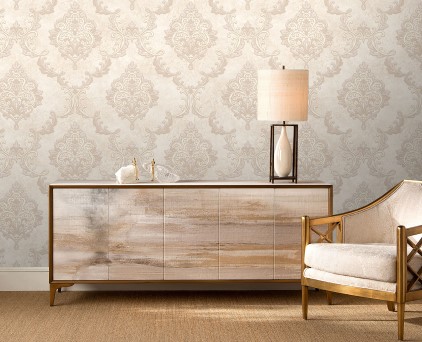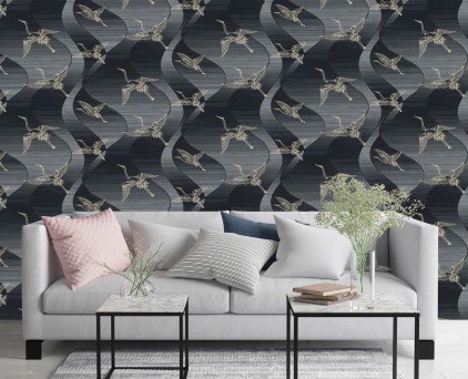 Фоновые обои нельзя обозначить как какой-то конкретный узор. Здесь можно увидеть и хаотичное движение холодных потоков воды, и срезы камня, и очертания скалистых берегов, и плотный туман на рассвете. На таком сложном базовом рисунке на декоративных полотнах добавлены ветки растений. Сами флористические элементы двух цветов, но с добавлением минимального количества серебряных блесток. Такой сложный минимализм, при правильном подборе мебели и акцентных аксессуаров, может создать интерьер в стиле не только модерн, но и романтизма.